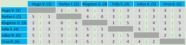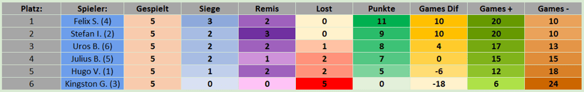 Gruppe B wurde dieses mal mit einer Rückrunde gespielt! Somit hatte jeder Spieler die Möglichkeit, eine Niederlage wieder auszubessern und zumindest in ein Remis zu wandeln. Der Sieger unserer April-Turniers war Felix, welcher nur zwei Remis hinnehmen musste. Ihm folgt Stefan, welcher ein Remis mehr zulassen musste. Rang drei ging an Uros mit nur einer Niederlage. Auf den Plätze 4, 5 und 6 folgten Julius, Hugo und Kingston.