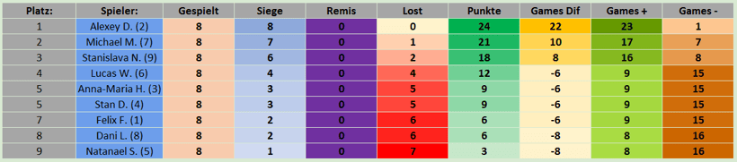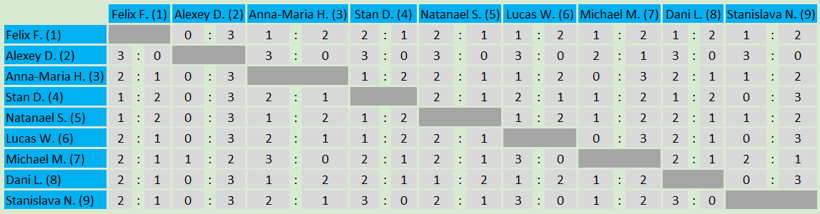 Die A-Gruppe wurde diesmal von Alexey klar gewonnen! Er konnte alle Gegner besiegen und sicherte sich somit deutlich und verdient den ersten Platz! Rang zwei ging an Michael, welcher mit nur einer Niederlage Alexey folgte. Der dritte Rang ging an Stanislava, welche als bestes Mädchen knapp vor Lucas lag. Den fünften Patz teilten sich Anna-Maria und Stan, gefolgt von Felix, Dani und Natanael.