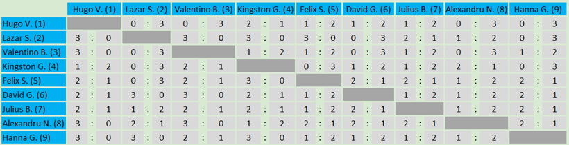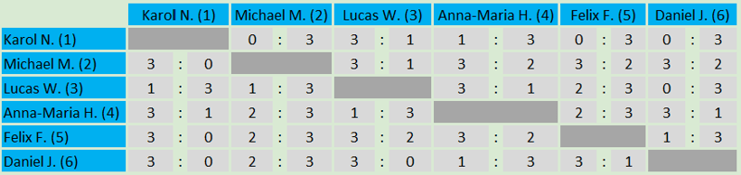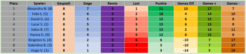 In der A-Gruppe konnte sich diesesmal Michael gegen alle Gegner behaupten und errang ungeschlagen den Tagessieg. Auf Platz 2 folgt Daniel gefolgt von Felix. Auf Platz 4 folgt Anna-Maria. Die Plätze 5 und 6 gingen an Lucas bzw. Karol.