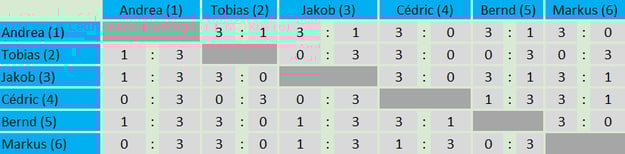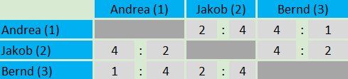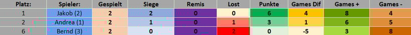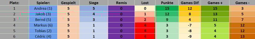 Auch in Gruppe 2 konnte die Siegerin Andrea ungeschlagen gewinnen. Jakob folgt auf Platz 2 mit 4 gewonnen Spielen. Platz 3 konnte sich Bernd mit 3 gewonnen Spielen holen.