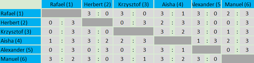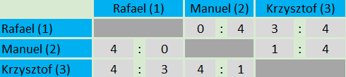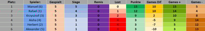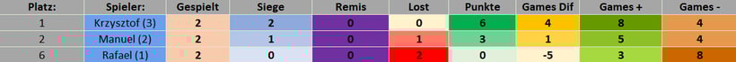 In Gruppe 1 konnte Manuel ungeschlagen den ersten Platz holen. Rafael folgt auf Platz 2 mit vier gewonnen Spielen. Krzysztof folgt auf Platz 3 mit mit drei gewonnen Spielen.