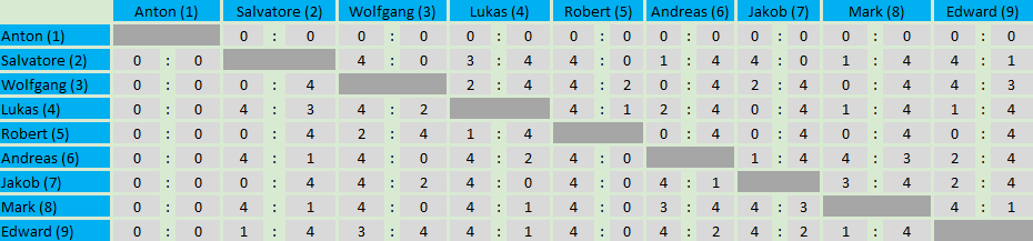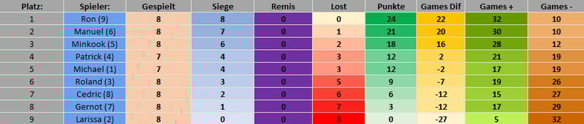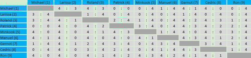 In Gruppe 1 "John McEnroe" konnte Ron ungeschlagen den ersten Platz für sich holen. Auf Platz 2 folgt Manuel mit sieben gewonnenen Spielen, auf Platz 3 Minkook mit sechs gewonnen Spielen.