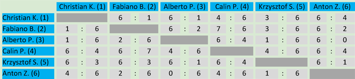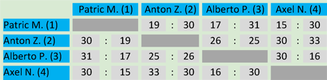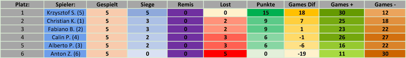 Gruppe 1 war sehr ausgeglichen und am Ende hatten 3 Spieler jeweils 2 Siege auf Ihrem Konto. Daher entschied das Punkteverhältnis über das Ausscheiden und dies musste Axel hinnehmen, denn er belegte hinter Alberto und Anton Platz 3. Auf Rang 4 klassierte sich Patric.