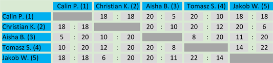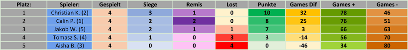 In Gruppe 3 hingegen ging es wieder etwas enger zu. So konnte sich zwar Christian zum Ende den ersten Platz sichern und Calin auf Rang zwei verweisen. Knapp dahinter lag Jakob vor Tomasz und Aisha.
