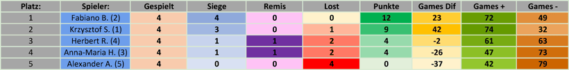 Gruppe 3 hatte zwei klare Aufsteiger. Fabiano und Krzysztof qualifizierten sich klar für die Endrunde. Auf Platz 3 landete Herbert vor Anna-Maria und dem Fünften Alexander.