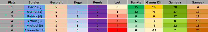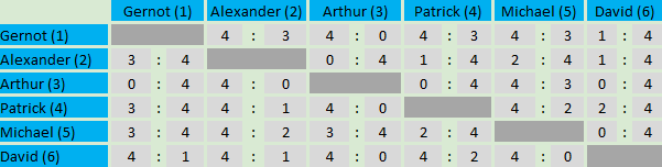 Auch in Gruppe 2 "Borg" konnte der Sieger David ungeschlagen den ersten Platz holen. Gernot konnte mit vier gewonnen Spielen den Platz 2 holen, Patrick folgt mit drei gewonnen Spielen auf Platz 3.