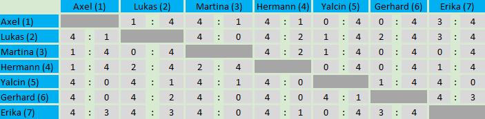 In Gruppe 1 "Nadal" konnte Gerhard ungeschlagen den ersten Platz für sich holen. Auf Platz 2 folgt Yalcin mit fünf gewonnenen Spielen, auf Platz 3 Erika mit vier gewonnen Spielen.