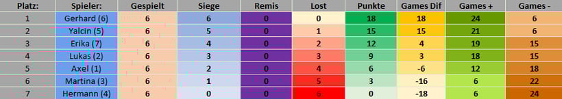 Auch diese Mal gab es wieder in der Vorrunde zwei Gruppen. Die drei besten Spieler der Gruppen sind in die Finalrunde aufgestiegen und haben dort um den ersten, zweiten und dritten Platz des Turnieres gespielt.