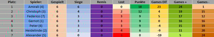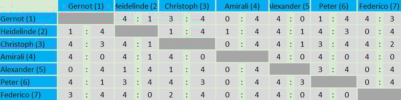 In Gruppe 1 "Serena Williams" konnte Amirali alle 6 Spiele gewinnen und holte ungeschlagen den ersten Platz. Auf Platz 2 folgt Christoph mit 4 Siegen, auf Platz 3 Gernot mit 3 Siegen.