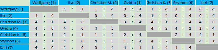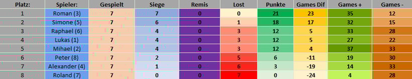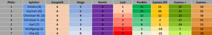 Auch diese Mal gab es wieder in der Vorrunde zwei Gruppen. Die drei besten Spieler der Gruppen sind in die Finalrunde aufgestiegen und haben dort um den ersten, zweiten und dritten Platz des Turnieres gespielt.