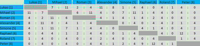 In Gruppe 1 "Andy Murray" konnte Roman ungeschlagen den ersten Platz für sich holen. Auf Platz 2 folgt Somine mit sechs gewonnenen Spielen, auf Platz 3 Raphael mit vier gewonnen Spielen.