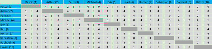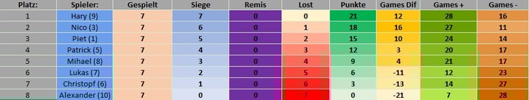 Auch diese Mal gab es wieder in der Vorrunde zwei Gruppen. Die drei besten Spieler der Gruppen sind in die Finalrunde aufgestiegen und haben dort um den ersten, zweiten und dritten Platz des Turnieres gespielt.