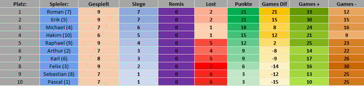 In Gruppe 1 "Billie Jean King " konnte Roman sieben Spiele gewinnen und holte den ersten Platz. Auf Platz 2 folgt Erik auch mit sieben gewonnenen Spielen, auf Platz 3 Michael mit sechs gewonnen Spielen.